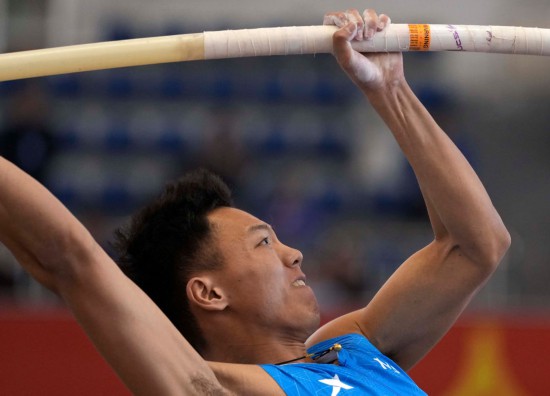 3月28日,陈兴华在男子七项全能撑杆跳高比赛中。新华社记者 雒圆 摄