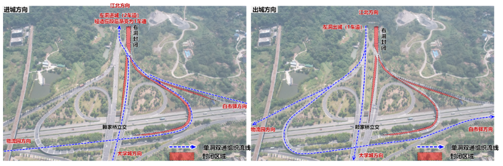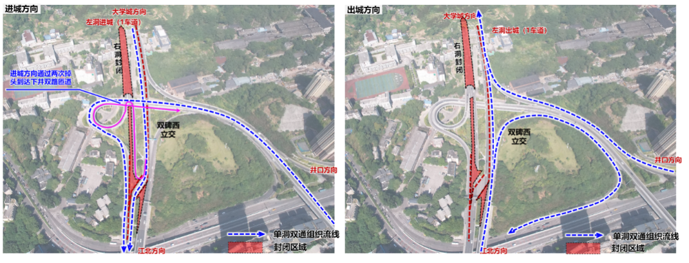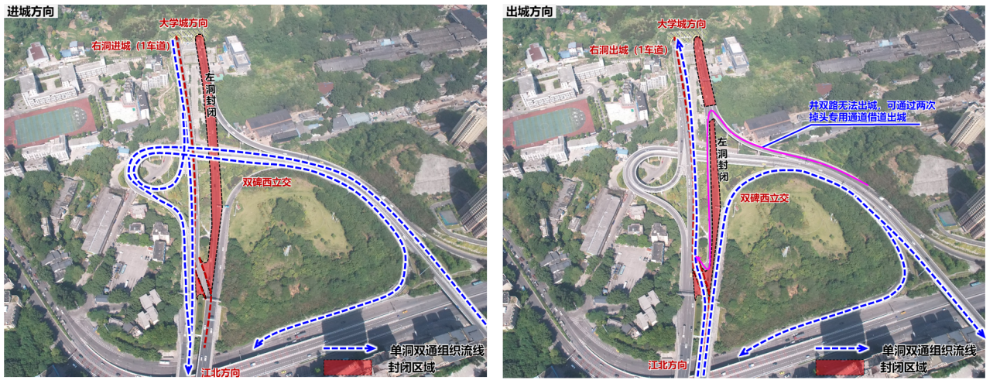 1.双碑隧道右线(大学城往江北方向)封闭施工期间,进城方向借道导改至左线隧道(出城方向),下道井双路需通过施工专用通道两次掉头。