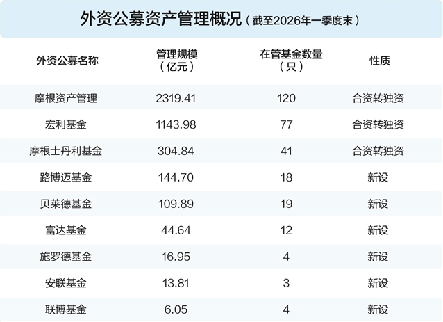 从规模表现来看,这种差异已逐步显现。Wind数据显示,截至2026年一季度,合资转独资机构在管理规模上保持领先。其中,摩根资产管理的管理规模已超过2300亿元,成为目前唯一一家规模突破2000亿元的外资公募;宏利基金规模超过1100亿元,摩根士丹利基金亦达到305亿元,整体处于数百亿元区间,具备较为稳固的市场基础。